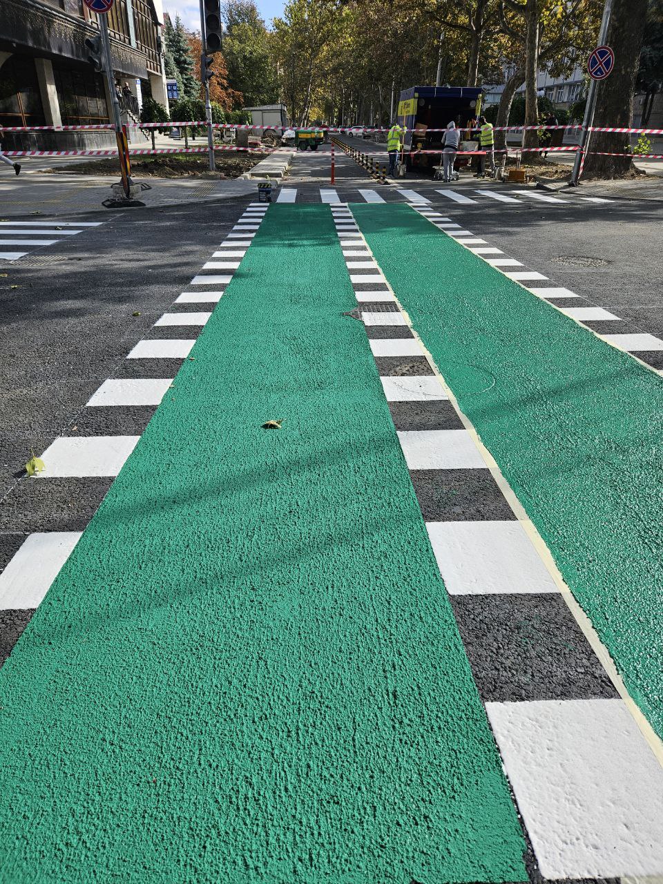 A fost actualizată marcajul rutier: treceri pentru pietoni cu zone verzi, piste pentru biciclete, elemente de separare. Au fost instalate stâlpi de semnalizare și protecție pentru siguranță sporită.